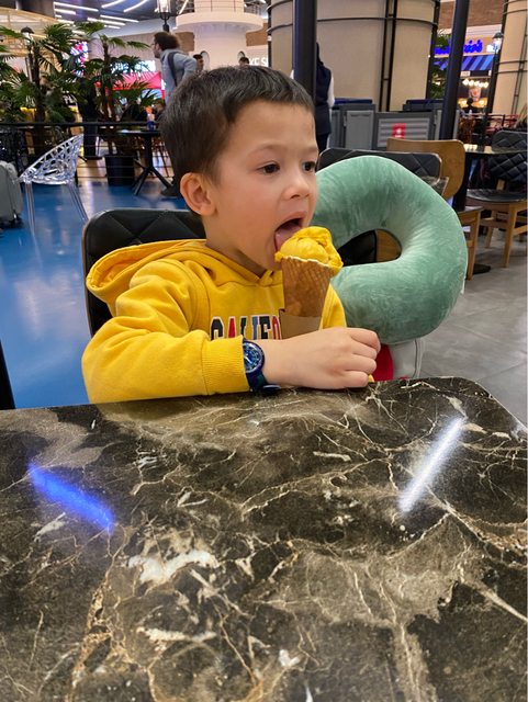 過完安檢登機門還沒公佈,大寶抱怨背包很重,還騙了一隻冰淇淋吃...然後才去搭Buggy