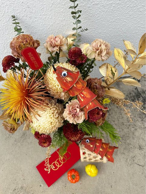 比較特別的是花藝作品結合金鯉魚配飾