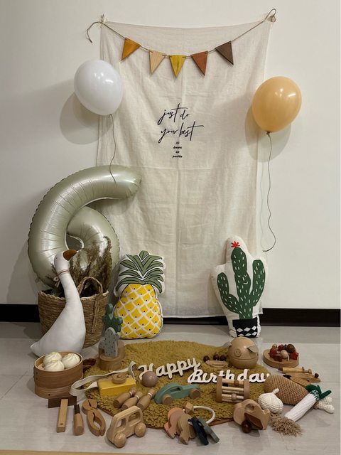 不論是抓周用的木質玩具還是搭配的佈景道具,