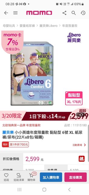 平常囤在購物車的過夜尿布從$3299直接降價到$2599(折700元),一片等於14.76元+送