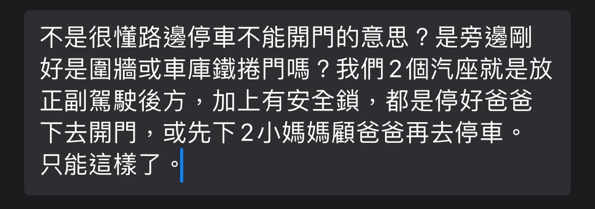 chiachizhang: 但因為帶小孩出去玩的地方都有停車場,很少路邊停 04/24 10:06
