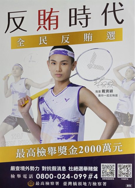 今年的反賄主軸為「嚴查境外勢力、對抗假消息、拒絕選舉賭盤」,由戴資穎擔任反賄大
