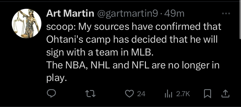 → bj451123: 我的來源告訴我大谷接下來會與mlb的球隊簽約。NBA,NFL已 12/05 00:38