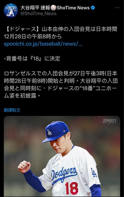 山本由伸加盟記者會將在台灣時間12/28禮拜四早上7點舉行