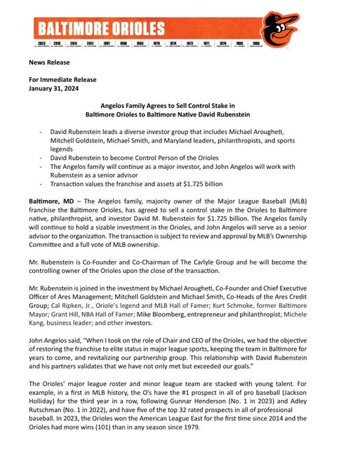 David Rubenstein發言人也確認Angelos家族仍持續是球團的投資人之一