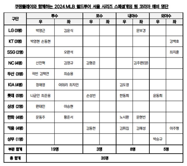 韓職公佈MLB首爾戰熱身賽的韓國隊35人初步名單