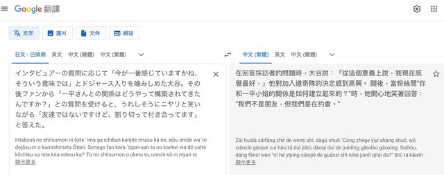 ,在問與答的環節中,被問到與水原一平關係,大谷翔平面帶微笑地說出:「我們不是朋
