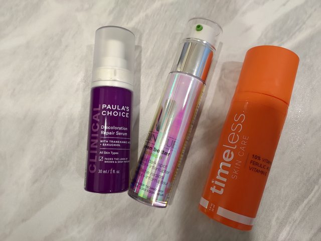 1. 左邊寶拉傳明酸: 因為寶拉維C實在太好氧化了XD, 所以拿傳明酸加減用,發現淡斑其
