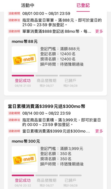 → weeafterwork: momo遇到活動真的送很大 27.147.12.47 08/18 08:02