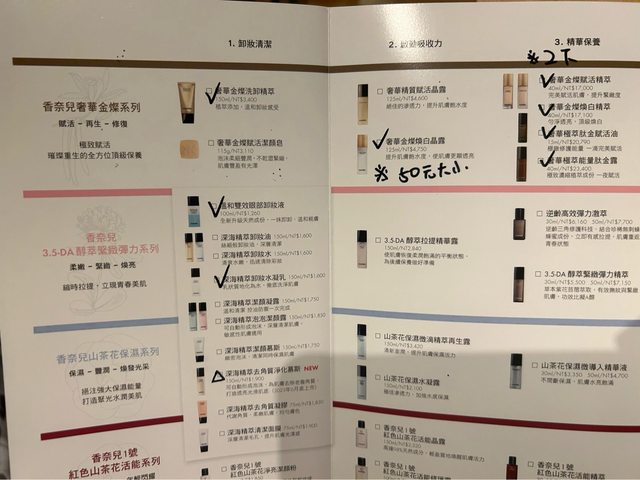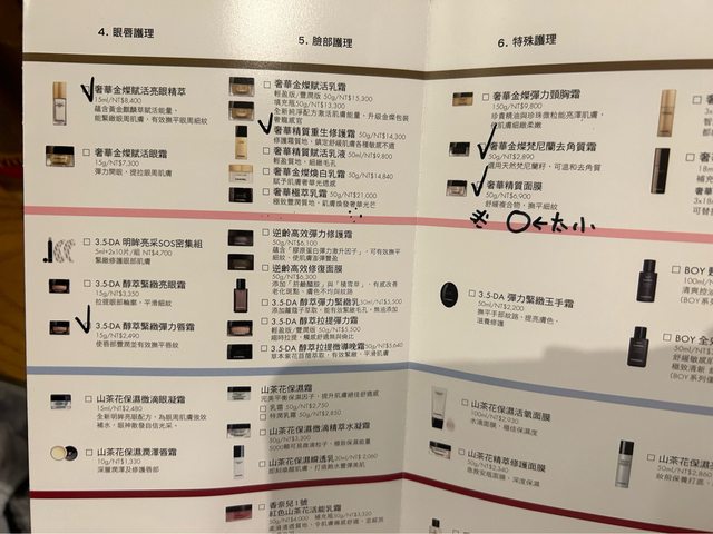 服務人員給我這張,通常都是勾選當次護膚使用的產品,但因為我有問一下產品的用量跟