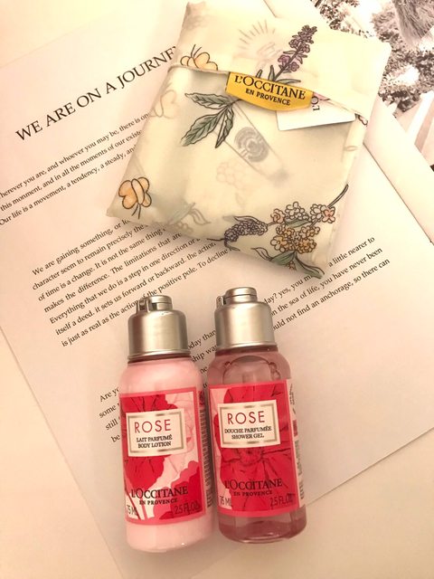 普羅旺斯薰衣草圖騰的購物袋,還有兩罐75ml的玫瑰沐浴+美體乳