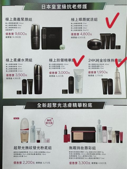 極上眼唇賦活組、24K純金珍珠持妝組跟極上防禦精華組