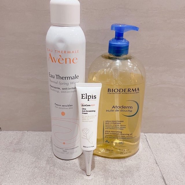 目前是用雅漾活泉水、貝膚沐浴油跟艾沛膚AD+特效霜