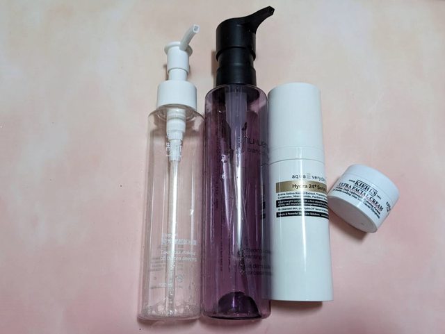 分別是專顏制所卸妝露、植村秀卸妝油、aquaEveryday精華與契爾氏乳液