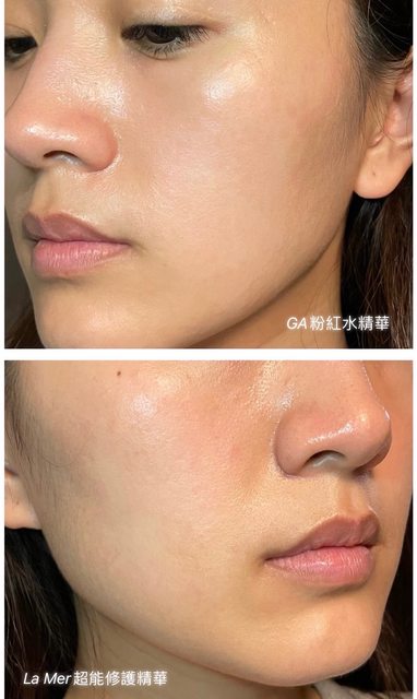 不知道這樣看不看得出來,雖然我喜歡La Mer家的修護效果,但我個人是覺得GA粉水的濕