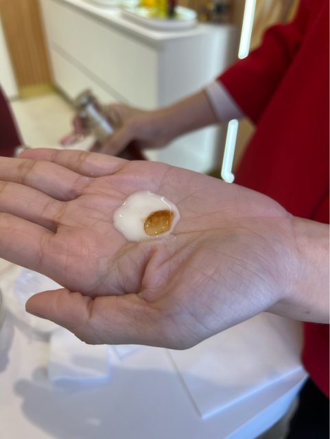 用到氧氣亮白精華的時候,櫃姐特別用雙激萃混合成了荷包蛋XD
