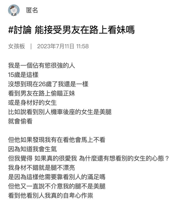 噓 cp120420 : 一堆台男看到不是自己女友的女生ㄈㄈ尺都可以在網 07/12 23:16