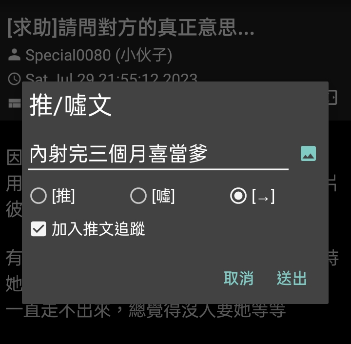 → c1510c : 卡個後續 看起來是對方也有好感 07/30 13:34