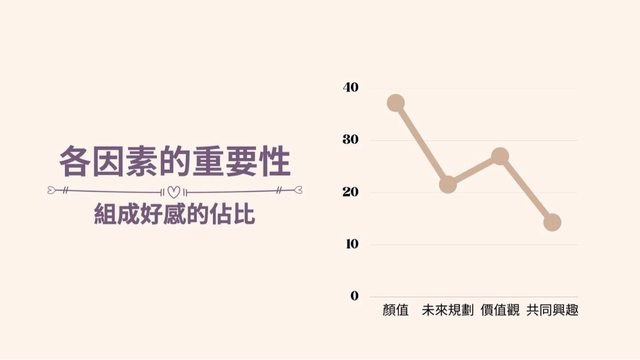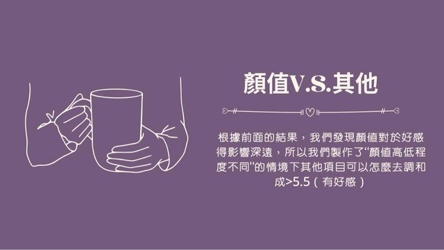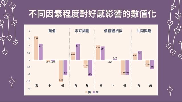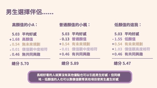11. 為了讓大家更好理解,我們依據前面的分析結果做出了幾個情境假設 (三種情境對 應到三種顏值) : 【情境 1】對於男生來說顏值高的另一半、無未來規劃、價值觀中度相符、且無共同 興趣,得出總分為 5.70 分 。 【情境 2】對於男生來說顏值中的另一半、有未來規劃、價值觀中度相符、且有共同 興 趣,得出總分為 5.89 分 。 【情境 3】對於男生來說顏值低的另一半、有未來規劃、價值觀高度相符、且有共同 興 趣,得出總分為 5.47 分 。 這三項分數其實都非常相近,代表這些不同條件組合而成的情境在男生眼中有差不多 的 好感度 。 長相好看的人就算沒有其他優點也可以引起男生好感,但同樣地,低顏值的人也可以 靠價值觀等其他項目使男生產生好感。 大家還有什麼新發現嗎? https://i.imgur.com/IEZvYHB.jpg