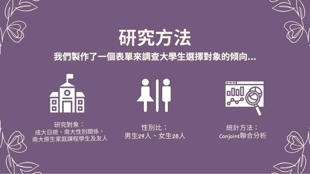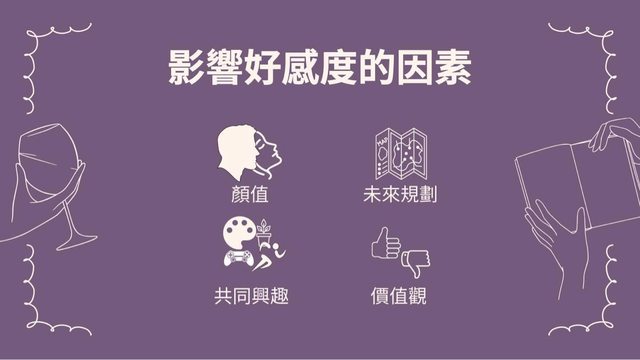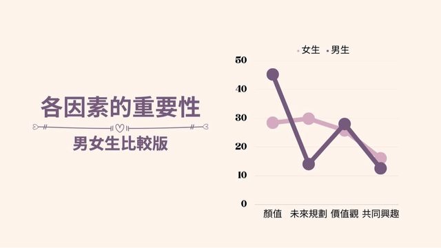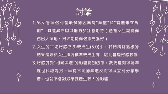 12. 我們簡單進行了幾項討論: 首先,男大學生和女大學生相差最多的因素為"顏值"及"有無謂有無未來規劃",我們認 為對於男生來說,社會期待扮演了影響男生相當重要的角色,男生從小會被社會灌輸 的 一個觀念是男生要男兒當自強,要出人頭地,要扛起家庭的重擔、因此男生在找伴 侶的 時候並不會傾向於尋找高上進心的伴侶,而是傾向於比較外在的事物,像是顏 值,跟更 多我們沒算進討論的因素,而女生則是相當看重伴侶的上進心,其重要性甚 至超越了顏 值,這也正面說明了現在的女大學生是相當看重另一半是否有無未來規劃 或共同興趣的 ,不過在這男女愈發平等的社會當中,未來這個差異會不會越來越小 呢?這是值得我們持 續去關注的。 其次,我們發現在女生的平均好感(3.9)較男生(5)小,我們猜測這樣的結果是源於女生 的擇偶標準較男生高,因此基礎好感較低,也有可能是因為女生在選擇另一半時,會 從 較低分(3.9)使用加分的方式去增加另一半的好感度 ; 而男生則會從中間值(5)開始因 不 同的因素進行加扣分。 最後,我們發現好感度受"相同興趣”的影響特別的低,我們推測可能年輕世代認為另 一 半有不同的興趣反而可以互相分享學習,也就不會對好感度產生較大的影響。 觀看完以上內容的大學生們,顏值高的人並不要感到驕傲,畢竟外在條件再好,沒有 內在條件的襯托,那也只是白搭;顏值低的人也不要感到灰心,僅管外在條件不佳, 可是擁有優秀的內在條件,就如同一朵未綻放的花朵,雖然外觀平凡,但它擁有美麗 的芬芳和充滿生命力,也是相當吸引人的,希望大家都能找到屬於自己的愛情! 各位讀者們還有沒有什麼其他的新發現呢?期待大家可以在下面討論。 https://i.imgur.com/xgpJHVl.jpg