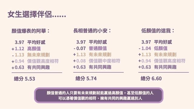 10. 為了讓大家更好理解,我們依據前面的分析結果做出了幾個情境假設 (三種情境對 應到三種顏值) : 【情境 1】對於女生來說顏值高的另一半、無未來規劃、價值觀高度相符、且有共同 興 趣,得出總分為 5.53 分 。 【情境 2】對於女生來說顏值中的另一半、有未來規劃、價值觀中度相符、且有共同 興 趣,得出總分為 5.74 分 。 【情境 3】對於女生來說顏值低的另一半、有未來規劃、價值觀高度相符、且有共同 興 趣,得出總分為 6.60 分 。 這三項分數其實相差不遠,代表這些不同條件組合而成的情境在女生眼中具有差不多 的 好感度 。 顏值普通的人只要有未來規劃就能贏過高顏值,甚至低顏值的人可以憑著價值觀的相 符、擁有共同的興趣贏過別人。 大家還有什麼新發現嗎? https://i.imgur.com/tS5NHoz.jpg