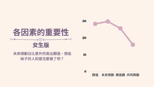 6. 將女生單獨拉出來發現,四個因素中影響女生對擇偶好感度最大的是未來規劃,其 次 是顏值,再來是價值觀及共同興趣,有趣的是女生的未來規劃佔比意外的高出顏 值,想 追妹子的人知道怎麼做了吧? https://i.imgur.com/Xb4L30I.jpg