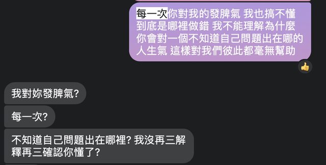 他也對我「發脾氣」、「吵架」這個用詞表示意見,他說他不會對我發脾氣(就算有情緒
