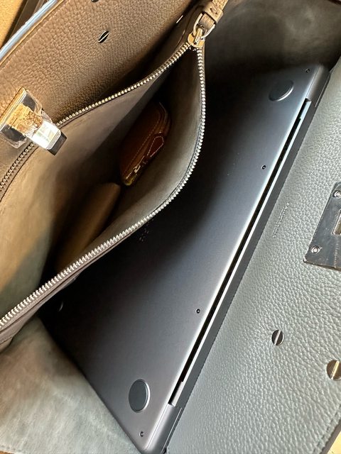 裝得下MacBook Pro 14”,內裏還附一個皮製小內袋,可單獨使用;包包配的是寬揹帶。