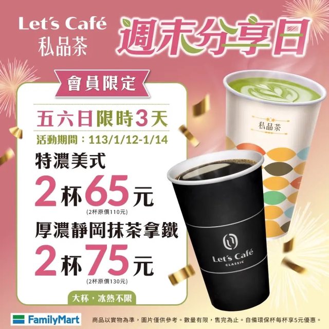 1月12日起至1月14日有特濃美式、抹茶拿鐵第二杯10元,且可手