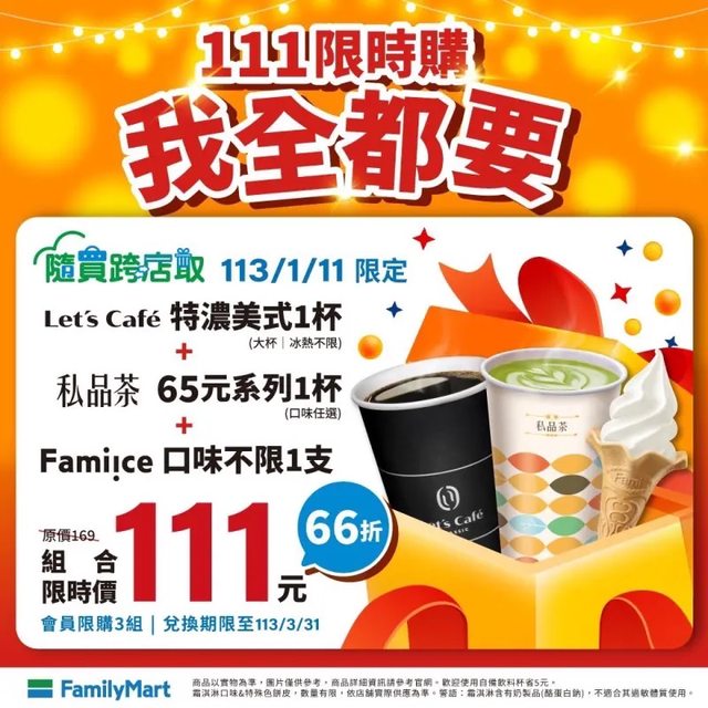 APP則有1月11日單日限定,特濃美式、私品茶、霜淇淋組合價111元(近