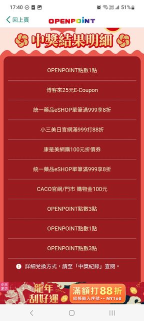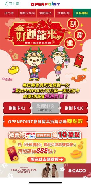 : : 2024/01/31 10:00~2024/02/27 19:00 OPENPOINT APP數位刮刮卡