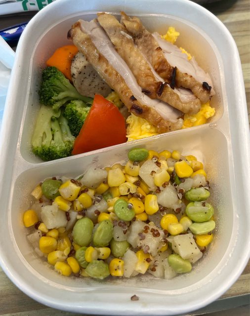 令我驚訝的是裡面完全沒有米飯,用離賣、毛豆、馬鈴薯和玉米來撐整個餐盒的一半,我