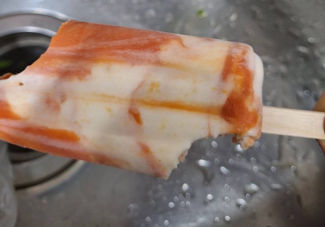 這隻冰棒看起來其實蠻漂亮的,木瓜味也很濃,甚至可以吃到疑似果肉的東西(非q彈口感