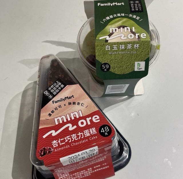 【商品名稱/價格】:全家杏仁巧克力蛋糕48元/白玉抹茶杯59元