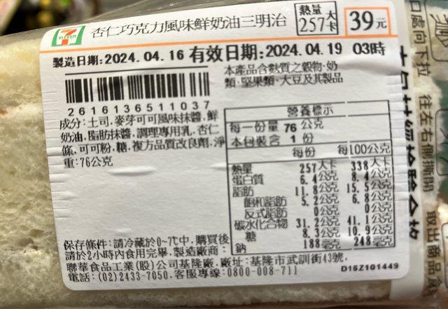 【商品名稱/價格】: 7-11 杏仁巧克力風味鮮奶油三明治 / 39元