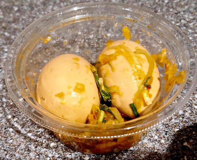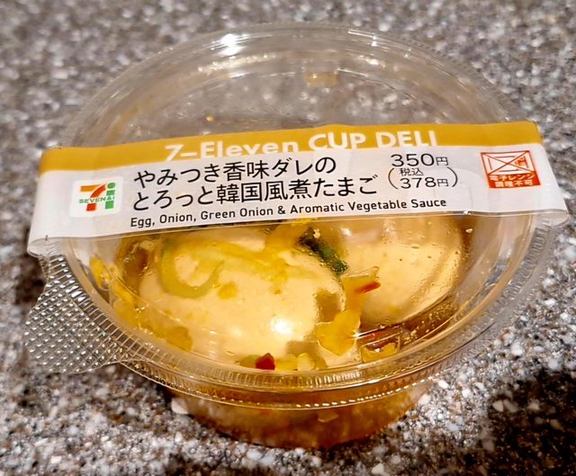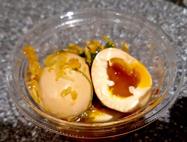 日本超商這類小盒的小菜其實很多種 這次挑了這個 蛋黃還呈現半熟 調味上其實不算辣