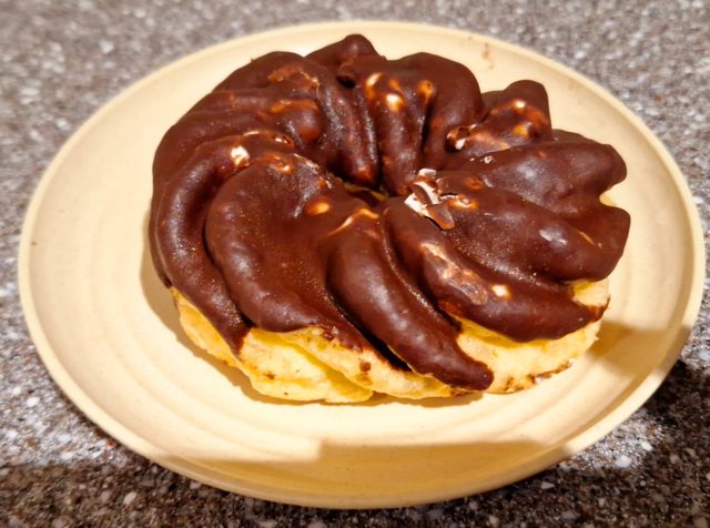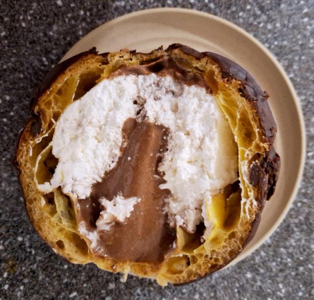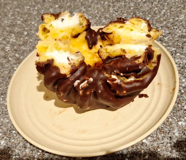 有點類似甜甜圈連鎖店的那種波浪造型甜甜圈 上面淋上巧克力 內餡則是滿滿的鮮奶油