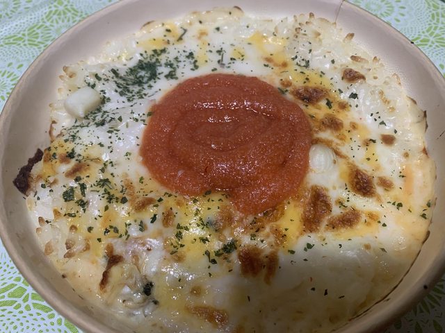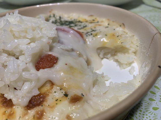 焗烤白醬的味道和份量也很夠,和飯搭配起來時,偏向醬泡飯的濃郁感。