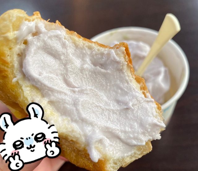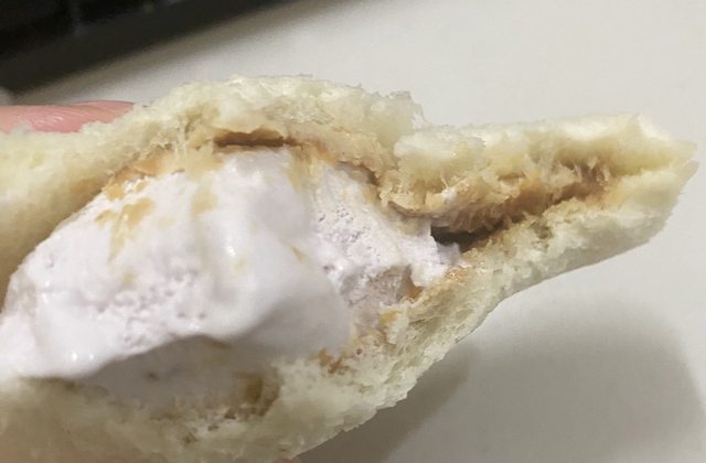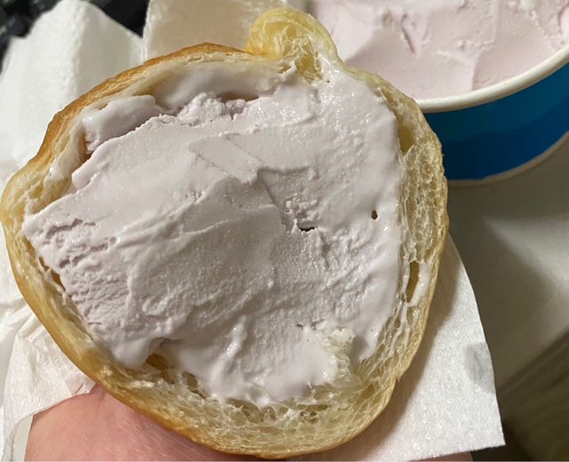 餐包咬一口後塞爆霜淇淋再一口咬下,開心~