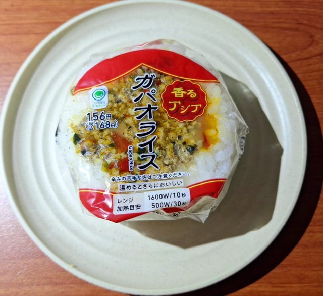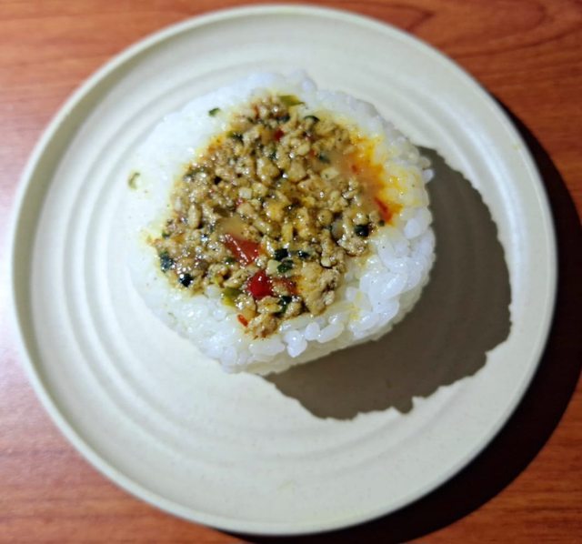 台灣超商偶爾也有打拋肉口味的飯糰 日本全家這款是沒有海苔的圓形版本 直接可以看到
