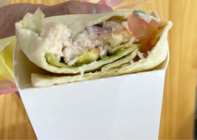 雞肉不會很澀,有包生菜、蕃茄片、跟洋蔥,咬下去至少每一口都有肉的感覺,涼涼的感
