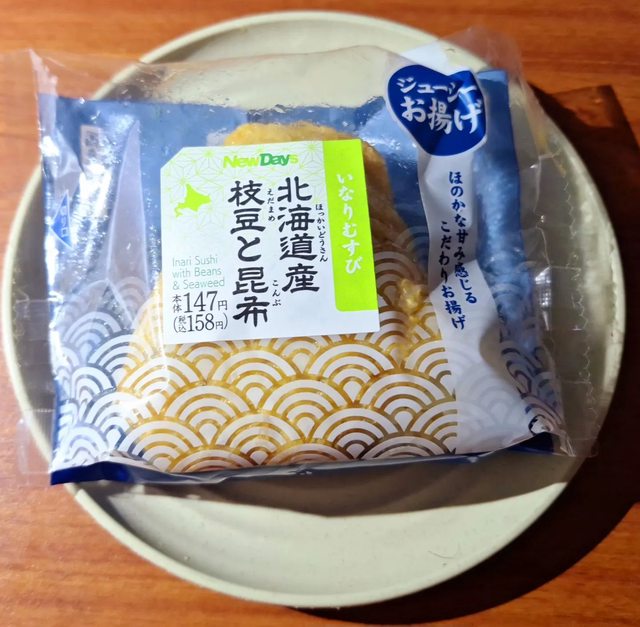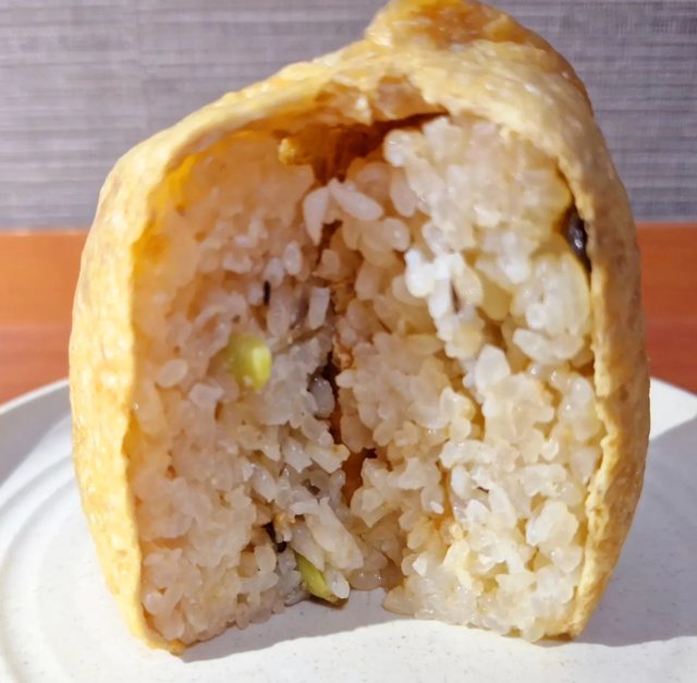 毛豆跟昆布的拌飯 包在豆皮壽司風格的飯糰 有點甜