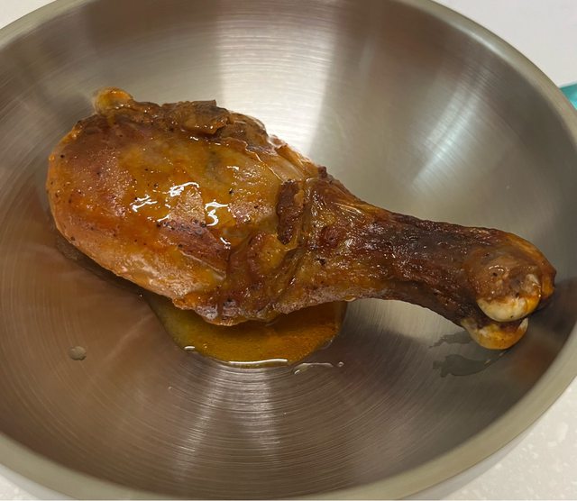 皮縮起來了,整支外表乾,要淋醬汁才會有油亮的感覺。不過整支很入味,些微香草味滿