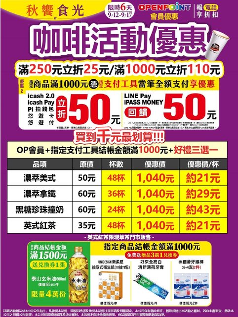 → candyhi: 濃拿36杯 折完1090 09/14 19:18