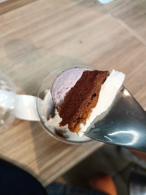 第一口覺得很不錯,吃起來很像生日蛋糕裡的芋泥。但是吃到巧克力蛋糕層之後,就感覺