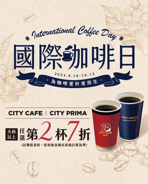1.CITY CAFE、CITY PRIMA大杯以上第二杯七折 可混搭
