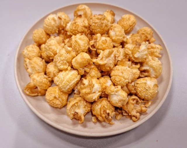 圓形的球狀爆米花 說辣是不會 不過吃多一點就會有麻麻的味道