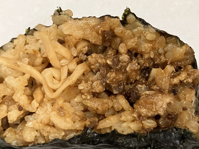 : 吃起來鹹香微辣,海苔和肉燥炸醬意外很搭,算是重口味的御飯糰,米飯有調味過,麵條