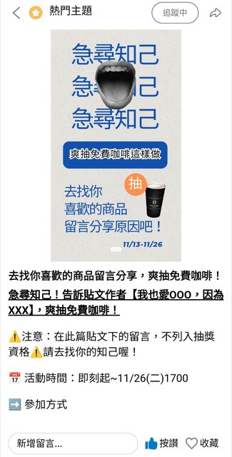 【活動內容】:急尋知己!告訴貼文作者【我也愛OOO,因為XXX】,爽抽免費咖啡!
