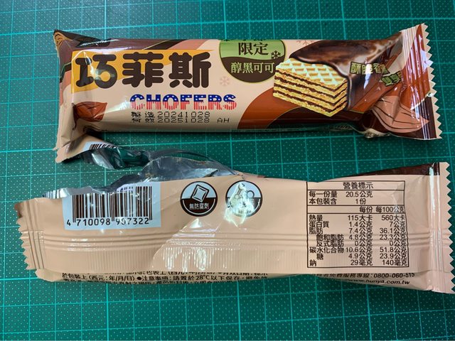 轉看巧菲斯夾心酥1條定價12元,份量差不多(19-20g)且是季節限定黑可可,就拿了。
